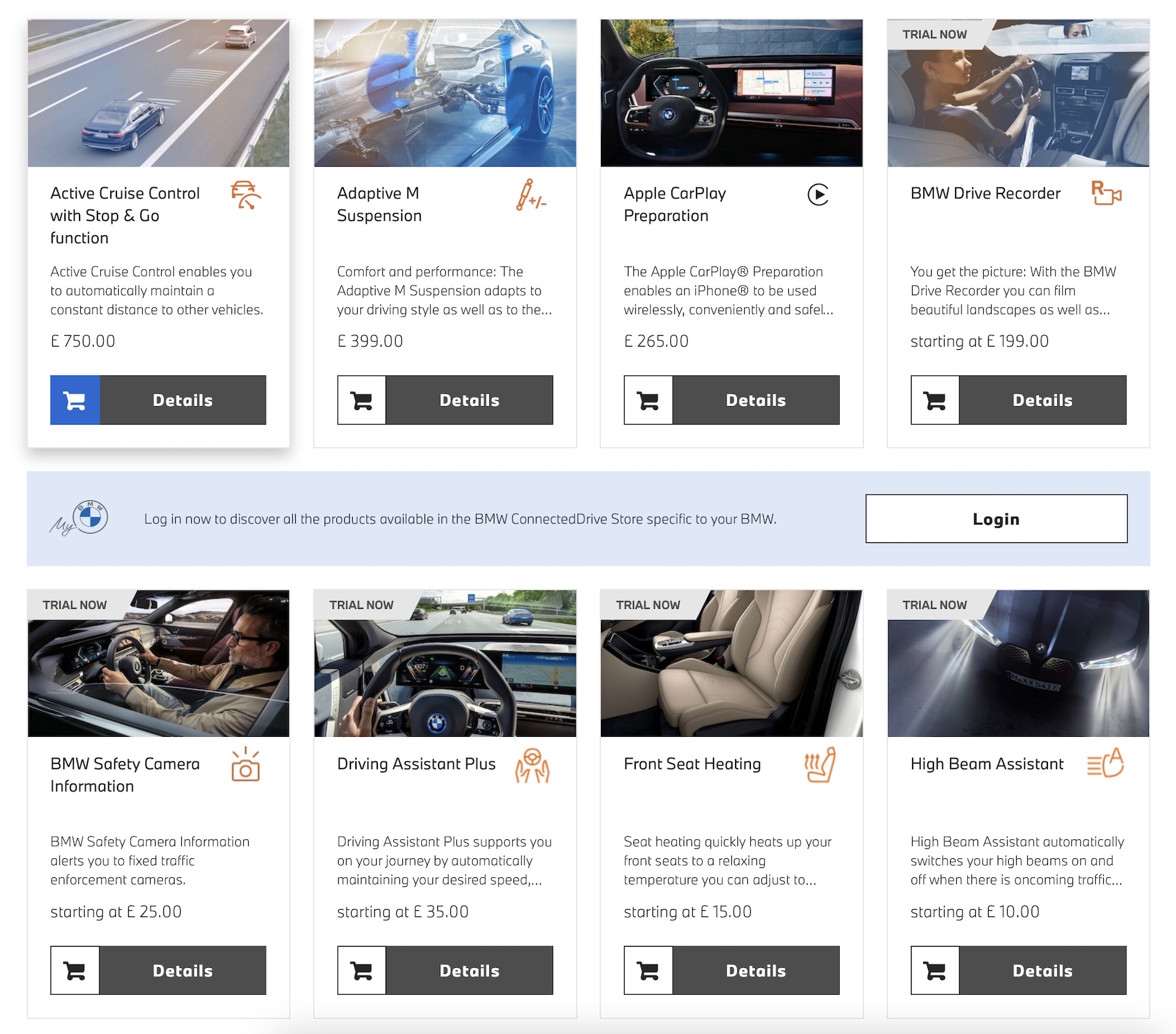 To wyjaśnienie wynika z faktu, że na rynkach takich jak Korea Południowa i Wielka Brytania nabywcy mogą teraz cyfrowo „zmodernizować” opcje wyposażenia dodatkowego, zapisując się na subskrypcję, która zapewnia dostęp do funkcji zainstalowanych w samochodzie fabrycznie, ale nieaktywnych. Brytyjczycy mogą odwiedzić sklep ConnectedDrive na stronie BMW i aktywować zestaw który chcieliby na pokładzie. Do wyboru są np. podgrzewane fotele za 15 GBP (85 zł) miesięcznie lub aktywny tempomat Drive Assistant Plus, za 35 GBP (200 zł) miesięcznie.