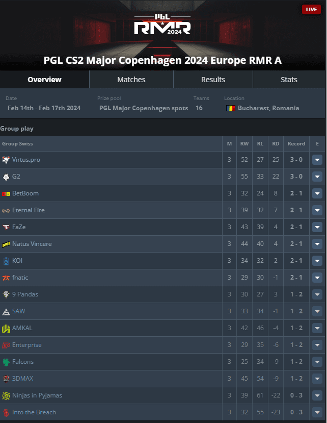 Kiepski mecz na Navi i nieudany powrót w meczu z BetBoom postawił zawodników Enterprise w nie najlepszej sytuacji. Po dobrym starcie na RMR nie został już żaden ślad. Od teraz każdy pojedynek będzie rozgrywany w formacie BO3. Porażka oznacza odpadnięcie z turnieju i pogrzebanie marzeń o wystąpienia drużyny z Polski na PGL Major Copenhaga 2024.