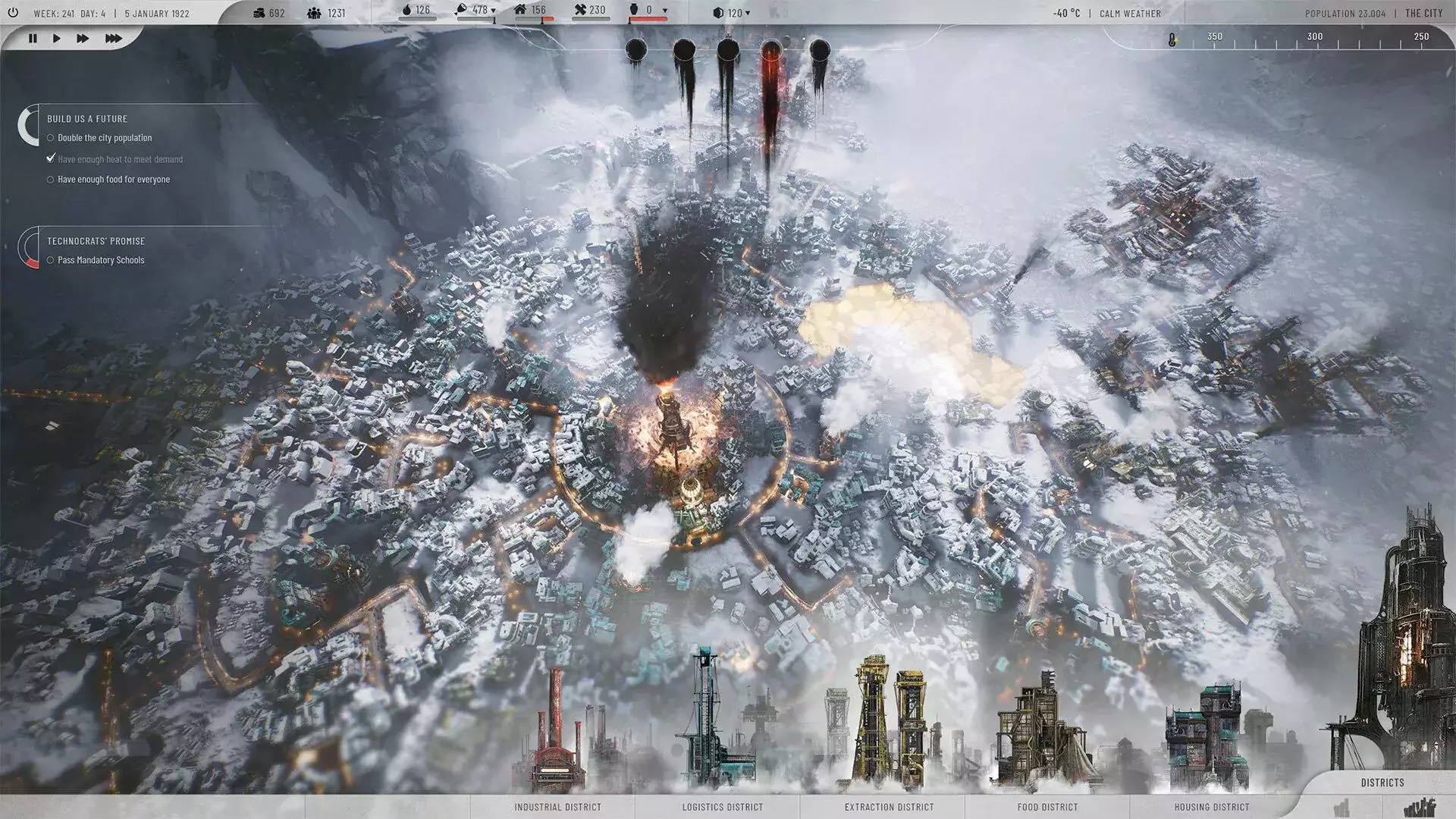 Frostpunk to strategiczna gra survivalowa wyprodukowana przez polskie studio 11 bit studios. Gameplay polegał na zarządzaniu miastem, rozwijania infrastruktury, czy również dbaniem o mieszkańców przyszłej metropolii – a co za tym idzie otrzymywaliśmy tym samym szereg trudnych decyzji moralnych.